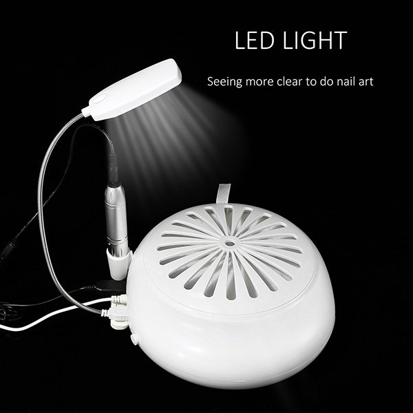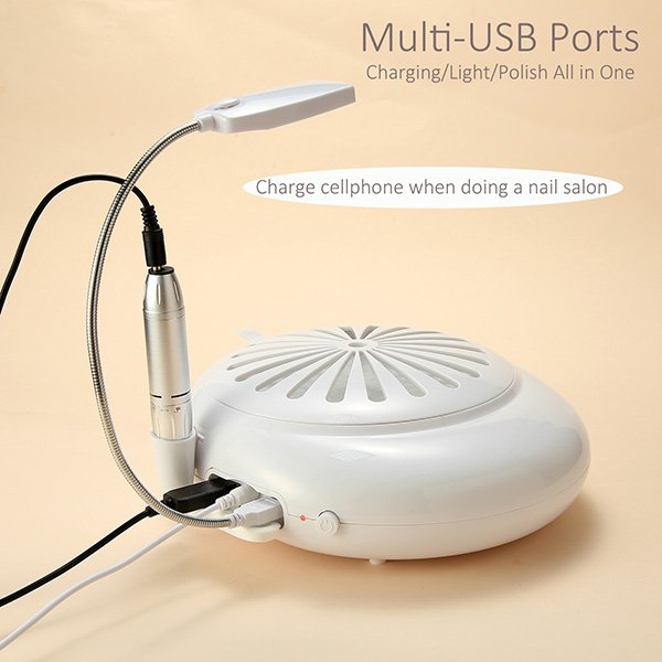 Wholesale Nail Dust Eliminator for clean nail ash, lightning, charging, and polish. When you do a nail salon it provides light so that nail experts can do art more easily. and a none-noisy design that customers feel comfortable all in one solution. It has 2 packs of fragrances for fresh air, some nail gels smell it could cover it completely. There are 2 USB ports on the machine you can also charge your cellphone while doing nail art. Compared with other manicure ash cleaners it is easy to process even by new.